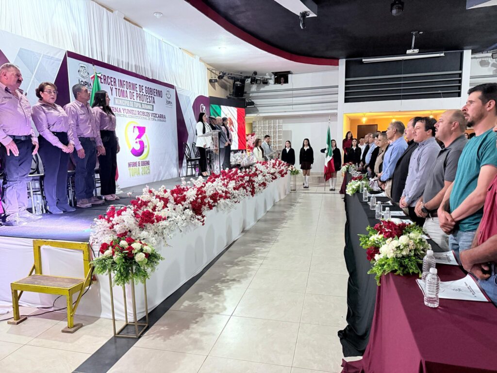 Con fundamenteo en el Ley Ley Orgánica del Municipio Libre del Estado de Durango, se llevó a cabo el 3er. Informe de Gobierno de la Presidenta Municipal Ing. Yunely Robles Vizcarra, en un evento en donde se dieron a conocer los resultados de tres años de gestión y trabajo ante representantes de la sociedad civil y gobierno. Una vez finalizado el informe que marca la Ley, se dio arranque a la Administración Municipal 2025-2028 del Ayuntamiento de Topia, reeligiendo a la Alcaldesa por voto popular. Posterior al acto protocolario de toma de protesta a la Alcaldesa reelcta, se procedió a que la misma tome protesta del H. Cabildo que la habrá de acompañar durante este segundo periodo de gobierno; en donde se habrá de redoblar esfuerzos para llevar bienestar a la población de Topia.